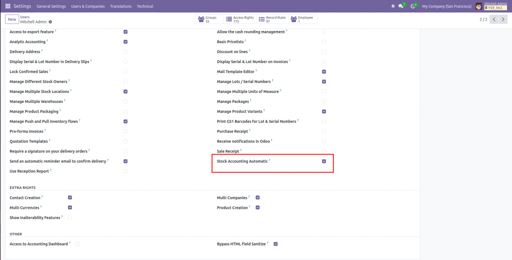 - Enable the option Stock Accounting Automatic. This setting allows the user to set product catogories to automatically manage inventory accounting entries.