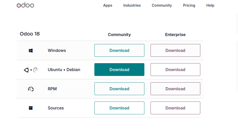 Visit the Odoo Download Page and fill out the form to download the .deb file for Odoo 18. Make sure to select the Debian version for your Raspberry Pi OS.